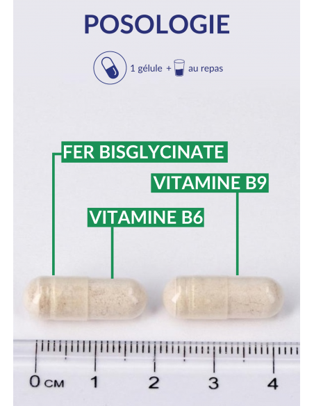 Fer Forte is a dietary supplement designed to meet the iron needs of individuals with specific diets or requirements, such as pregnant women, vegetarians, or vegans. This product utilizes a bioavailable iron salt, iron bisglycinate, known for its excellent absorption and superior digestive tolerance.[1] Enriched with vitamins B6 and B9 in their bioactive forms, Fer Forte offers an effective synergy to support overall health.