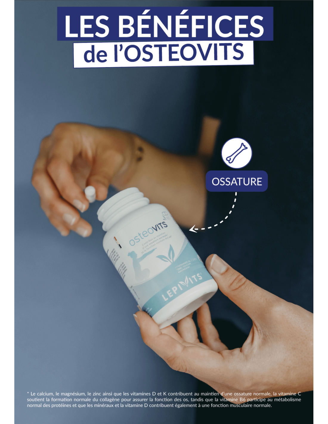 Osteovits is a food supplement based on vitamins D3 and K2 combined with magnesium and zinc which contribute to the maintenance of normal bones. The addition of calcium is necessary for the maintenance of normal bone structure. Vitamin C contributes to the normal formation of collagen for normal bone function. Vitamin B6 contributes to normal protein metabolism.