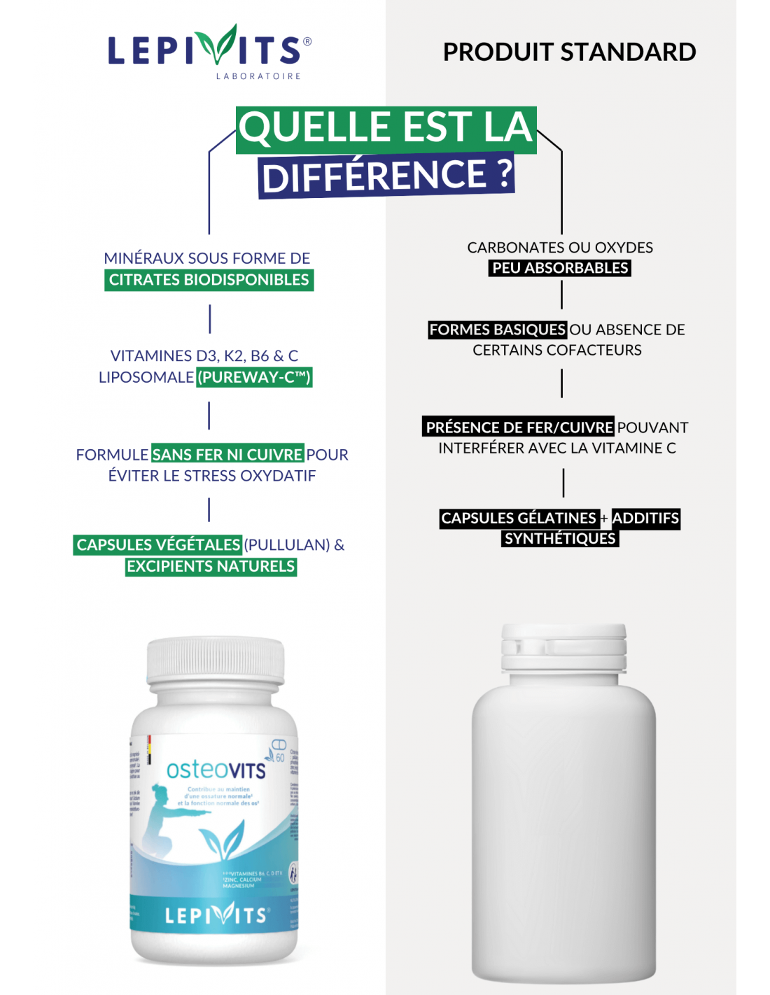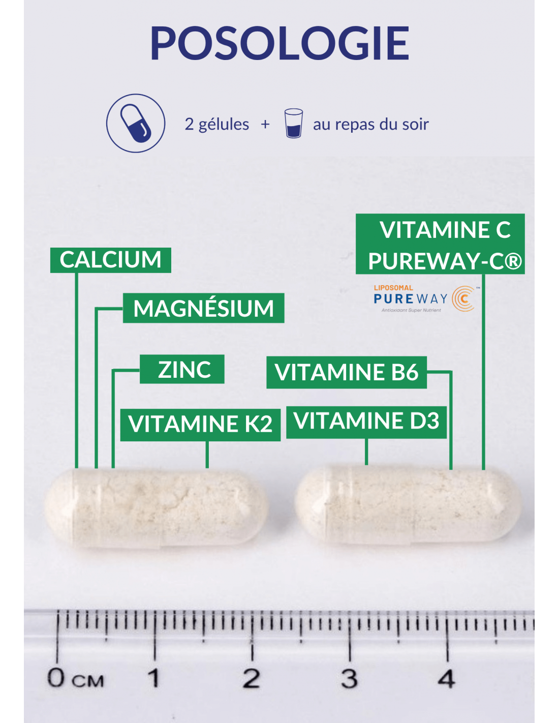 - Calcium citrate, magnesium citrate; capsule shell: pullulan; vitamin C (Liposomal PureWay-C™); emulsifier: phospholipids E322; vitamin K2 (menaquinone), zinc citrate; emulsifier: fatty acids E570; vitamin D3 (cholecalciferol), vitamin B6 (pyridoxine hydrochloride), citric bioflavonoids.