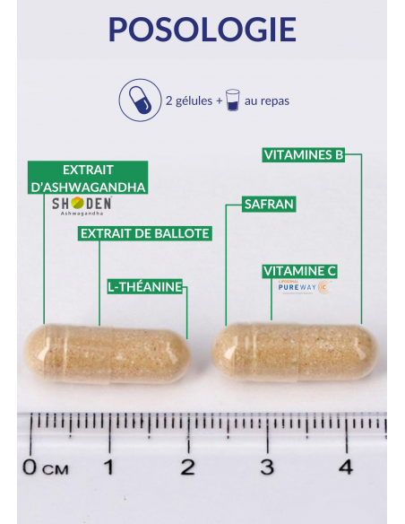 Saffron Of which 7.5% Crocine and 3% Safranal. L-Theanine Extract of Ballote Extract of Ashwagandha Of which 35% Withanolide Nicotinamide Vitamin B1 Vitamin B2 vitamin B5 vitamin B6 Vitamin B9 Vitamin B12 Vitamin C (PureWay-C®) Zinc |