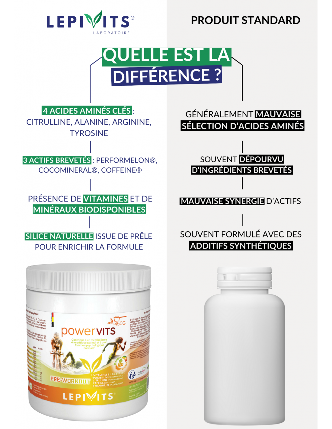 - Thanks to its high bioavailability formulation, Powervits ensures rapid and efficient nutrient assimilation at the cellular level. This means that the active components are quickly available to muscle and nerve cells, allowing for an immediate effect on performance. This pre-workout also includes bamboo extract, standardized in silicon. Used in this formula as a natural additive, it plays a role in supporting joint health by promoting comfort and mobility, both during exertion and recovery phases. Silicon is essential for the structure of cartilage and connective tissues, helping to protect joints from the stresses exerted during intense workouts.
