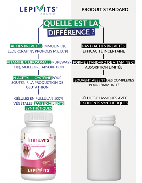 Designed to boost the immune system, this product is a natural and effective response to immune challenges, particularly useful during periods of stress or seasonal changes. Immuvits is distinguished by its unique composition, combining patented and scientifically proven ingredients to offer optimum protection against external aggressors.