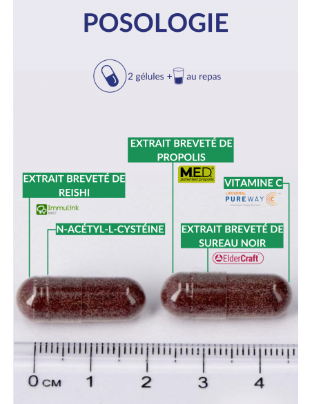 Immulink® Patented Reishi extract ElderCraft® Patented black elderberry extract Including 14% anthocyanins ESIT12 - M.E.D.® brown propolis Patented extract of Propolis Including 12% polyphenols N-acetyl-L-cysteine Vitamin C (PureWay-C™) |