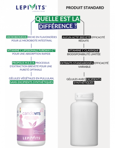 The unique combination of Microbiomex®, MED® propolis, and PureWay-C™ vitamin C, along with highly titrated plant extracts, makes Candovits an unmatched supplement on the market. Microbiomex® contains a patented flavobiotic, the first of its kind, derived from natural extracts of orange and grapefruit, exceptionally rich in hesperidin and naringin, two flavonoids known for their ability to promote an intestinal ecosystem according to clinical studies, though they do not have recognized health claims. These active compounds favorably enrich the intestinal microbiome, which is essential as a healthy microbiome is key to maintaining good immune function, optimal digestion, and overall well-being.