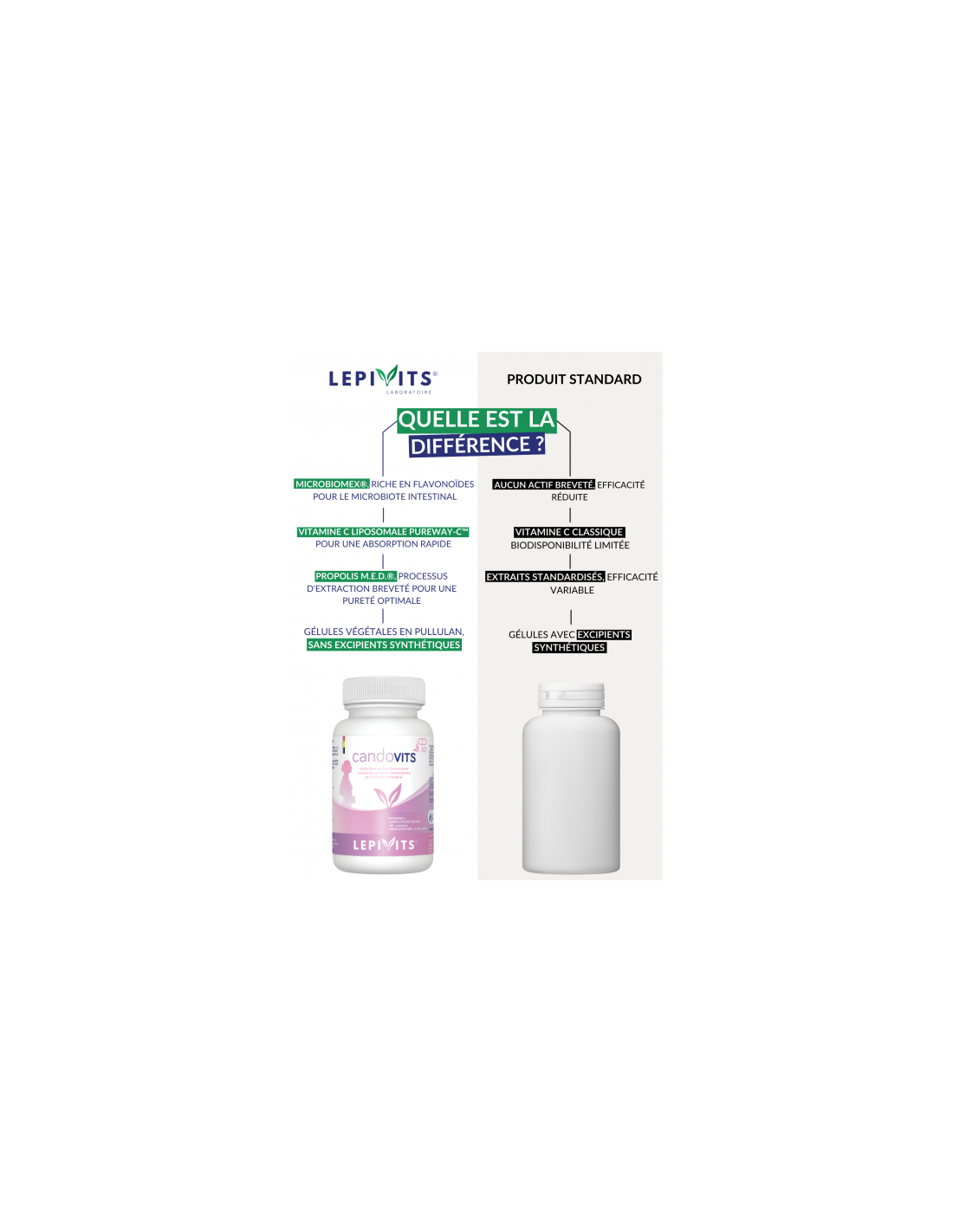 - MED® propolis and PureWay-C™ vitamin C: Candovits also incorporates MED® propolis and PureWay-C™ vitamin C, two components that ensure exceptional purity and bioavailability. MED® propolis, obtained through a patented extraction process, offers a complete polyphenolic profile, making it one of the purest and most bioactive forms of propolis available. Although Propolis does not have health claims, many studies note interesting properties for this active.