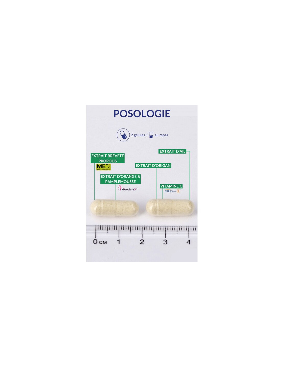 - Microbiomex® (orange and grapefruit extract); dried extract of olive tree (Olea europea L. - leaf) titrated in oleuropepin; capsule shell: pullulan; dried extract of brown propolis ESIT12 - M.E.D. dried extract of oregano (Origanum vulgare - leaf) titrated in carvacrol; dried extract of garlic (Allium sativum - bulb) titrated in allicin; vitamin C (Liposomal PureWay-CTM); emulsifiers: lecithin E322, fatty acids E570; citric bioflavonoids.