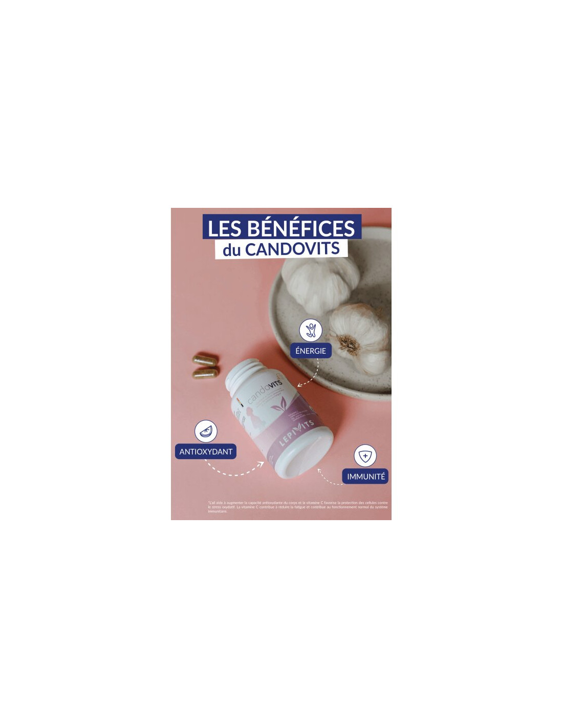 In our daily lives, exposed to stress and dietary imbalances, the intestinal microbiome can quickly become compromised, leading to a variety of discomforts and negative impacts on our health. Candovits harmoniously combines the effectiveness of Microbiomex®, a patented active ingredient, with a careful selection of highly concentrated plant extracts and liposomal vitamin C. This unique combination aims to balance the intestinal ecosystem by nourishing a community of essential microorganisms in our microbiome, while strengthening the body's natural defenses against external aggressions. To do this, it relies on several elements including vitamin C and garlic, known for their antioxidant capabilities.