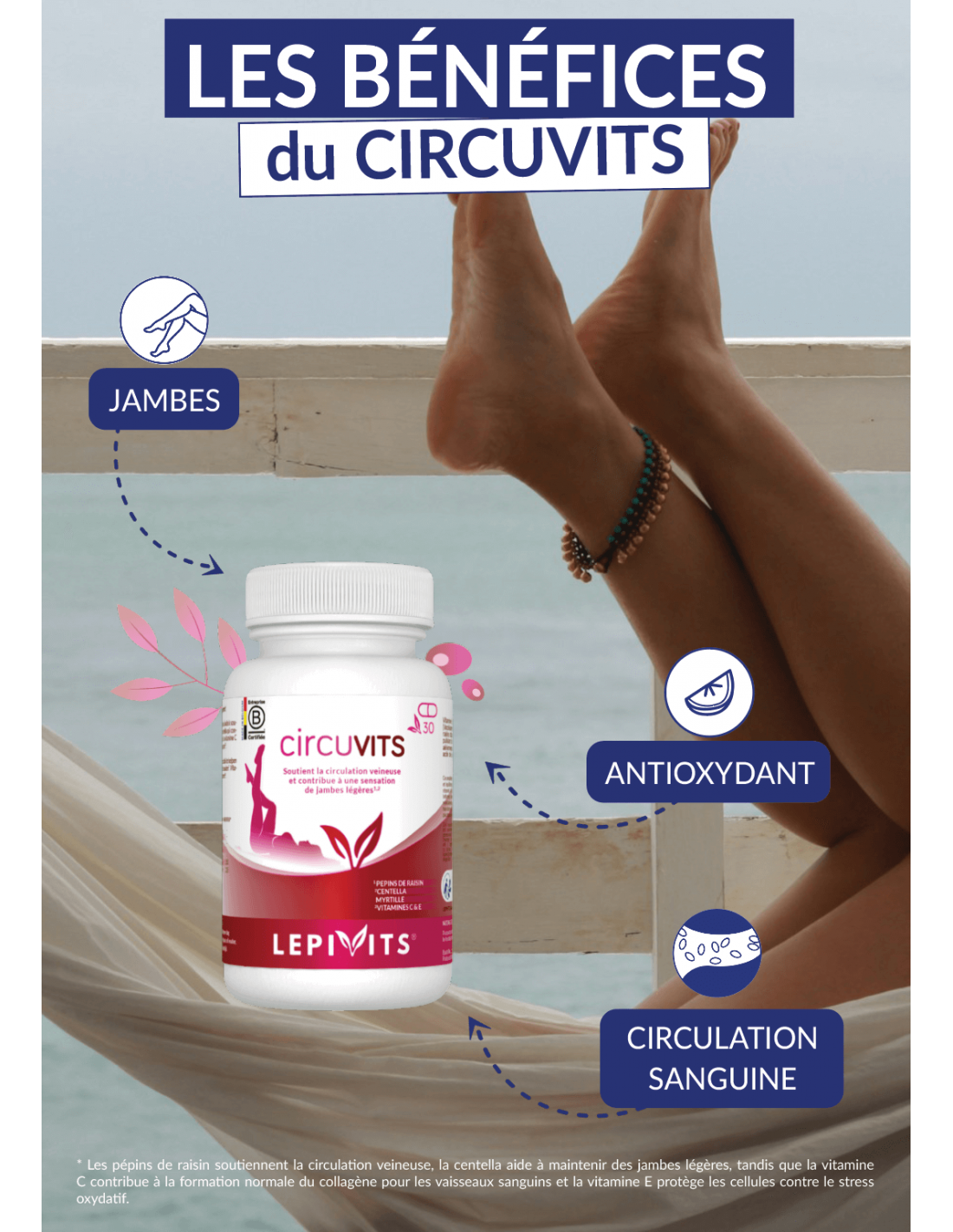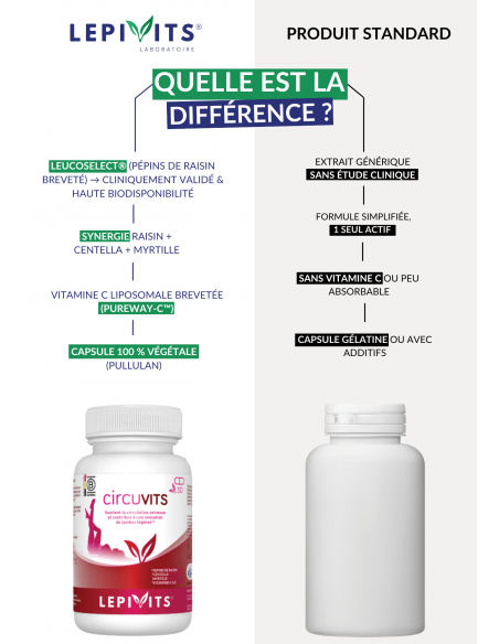 Are your summers synonymous with heavy and tired legs? Try Circuvits! This dietary supplement is specially formulated to support venous circulation and provide a feeling of lightness and vitality. Circuvits combines two high-quality patented ingredients, Leucoselect® and PureWay-C™, to naturally support the health of your legs.