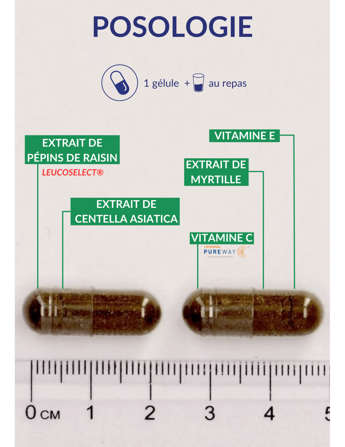 - Vitamin C (Liposomal PureWay-C™); Dried bilberry extract (Vaccinium myrtillus - fruit); Leucoselect® (grape seed extract standardised to 85% OPC**); capsule shell : pullulan; Centella asiatica dried extract (Centella asiatica - aerial parts); emulsifier: lecithins E322; Vitamin E (D-alpha-tocopherol acid succinate); emulsifier: fatty acids E570; citric bioflavonoids.