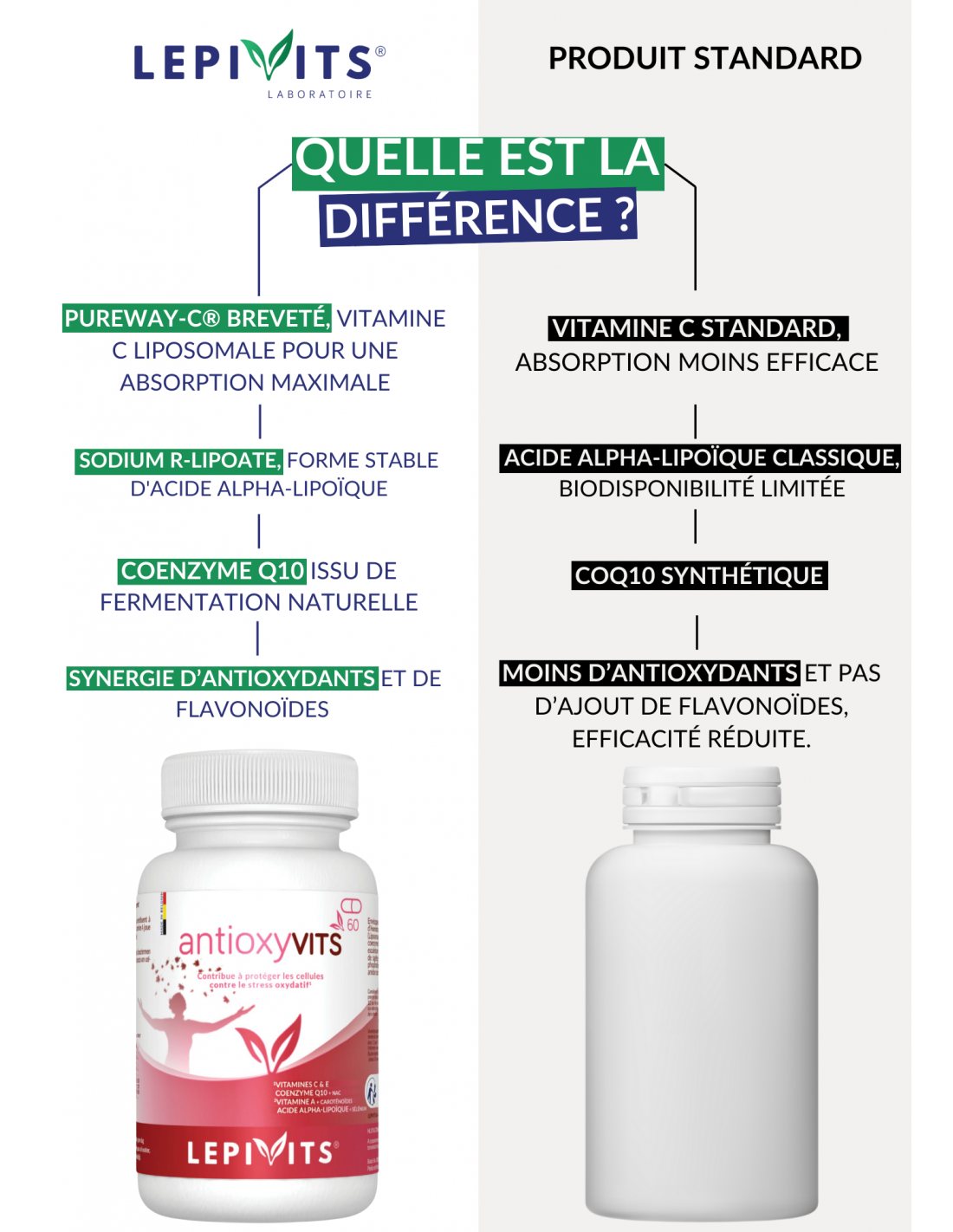 - A Revolution in Vitamin C: PureWay-C™ is a patented form of liposomal vitamin C. Unlike traditional ascorbic acid, PureWay-C™ is encapsulated in liposomes, allowing for better absorption and prolonged cellular retention. Clinical studies have shown that PureWay-C™ offers superior cellular retention of +233% and a 12% increase in antioxidant action compared to conventional forms of vitamin C.[1] This advanced technology ensures that your body fully benefits from the advantages of vitamin C, particularly in terms of reducing fatigue and protecting against oxidative stress.
