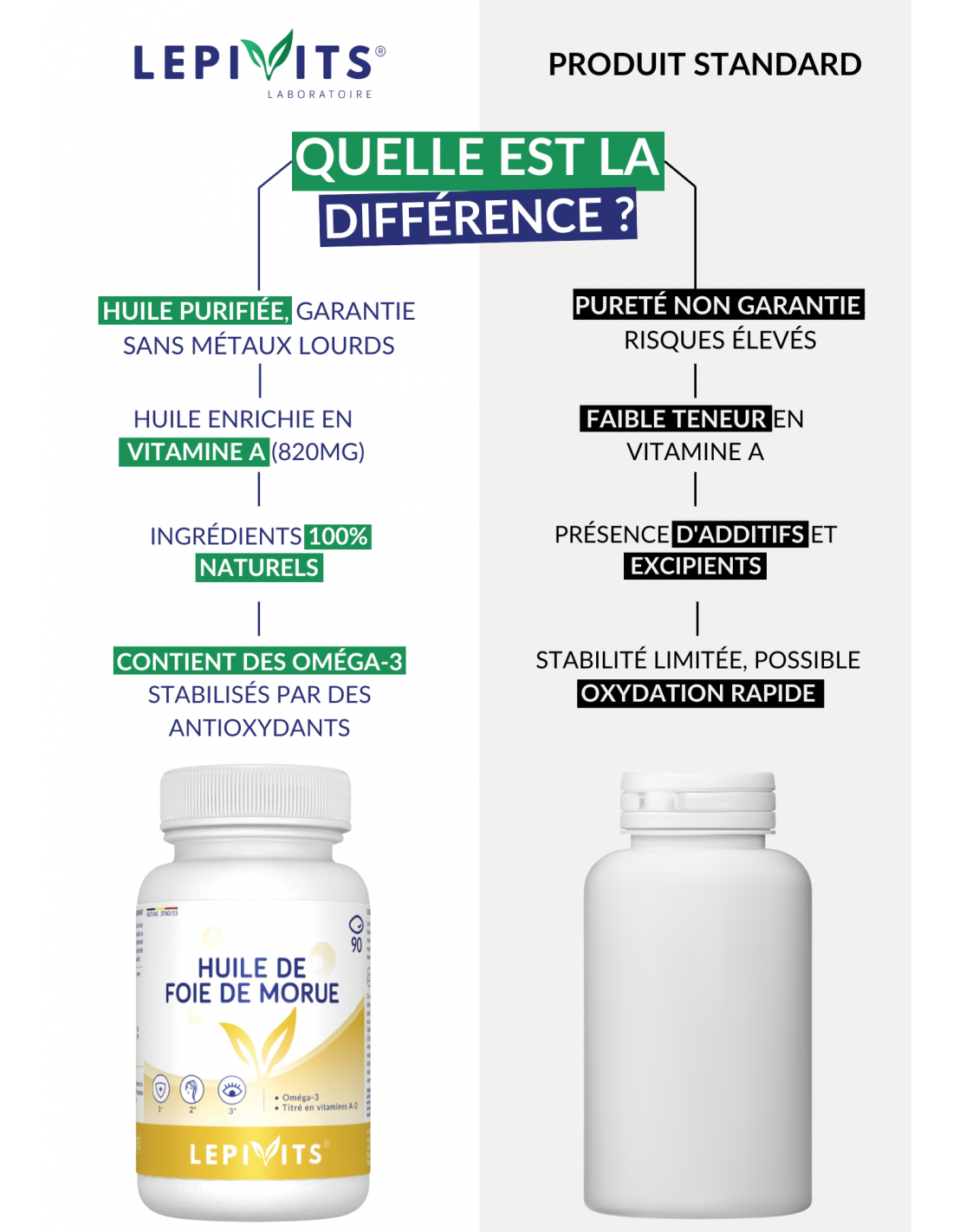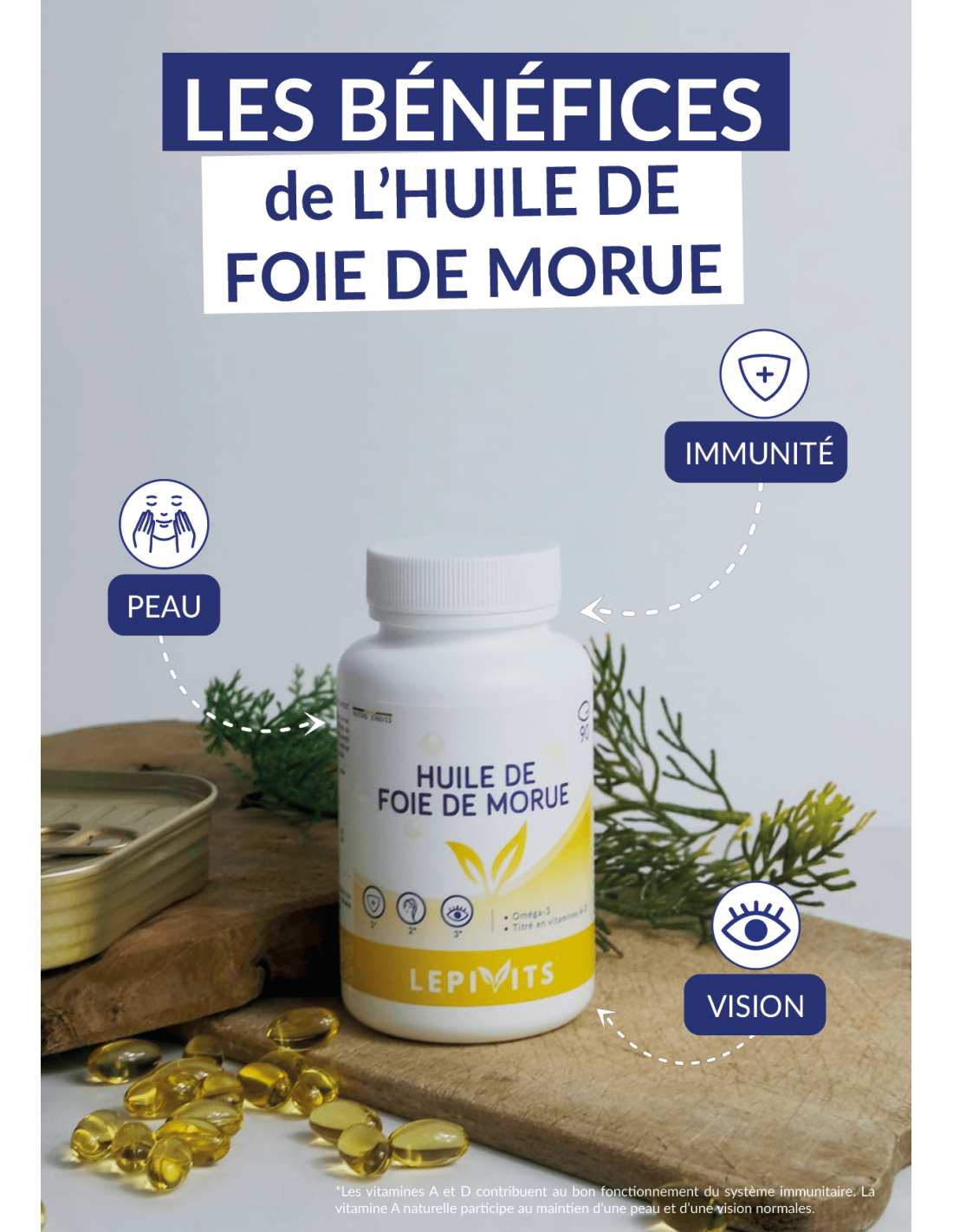 Souhaitez-vous découvrir comment l'huile de foie de morue peut agir sur votre santé ? L'huile de foie de morue LEPIVITS® est un allié pour votre santé. Ce complément alimentaire naturel, issu de la mer, est une source riche en micronutriments essentiels, notamment les vitamines A et D, ainsi que les acides gras oméga-3.