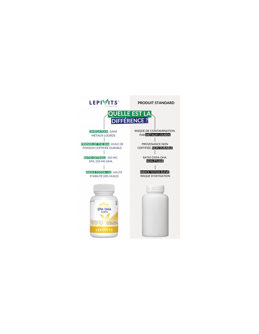 - Indice TOTOX : il s'agit d'une mesure de la fraîcheur et de la stabilité de l'huile de poisson, indiquant le niveau d'oxydation du produit. Un indice TOTOX inférieur à 20 est excellent, car il montre que l'huile est très fraîche et a subi un minimum d'oxydation, ce qui est essentiel pour préserver l'intégrité et l'efficacité des acides gras EPA et DHA. La stabilisation de la formule avec des antioxydants naturels, tels que les vitamines E et Vitaheess E, aide à protéger les acides gras oméga-3 de l'oxydation, assurant ainsi que le produit reste efficace et sûr à consommer sur le long terme.