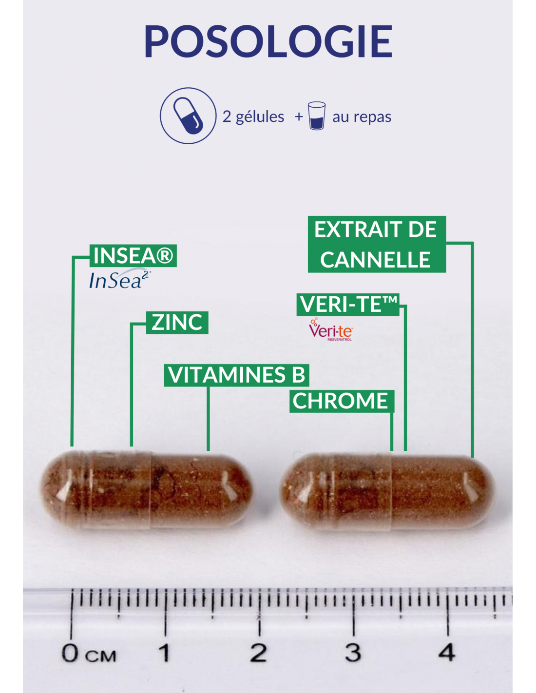 - Insea2® (Ascophyllum nodosum/Fucus vesiculosus - thallus), extrait sec de Cannelle (Cinnamomum verum - écorce), enveloppe de la gélule : pullulan, Trans-Resvératrol 98% (Veri-teTM), bisglycinate de zinc, amidon de riz, vitamine B3 (nicotinamide), vitamine B2 (riboflavine 5’-phosphate de sodium), vitamine B1 (chlorhydrate de thiamine), picolinate de chrome, vitamine B8 (D-biotine).