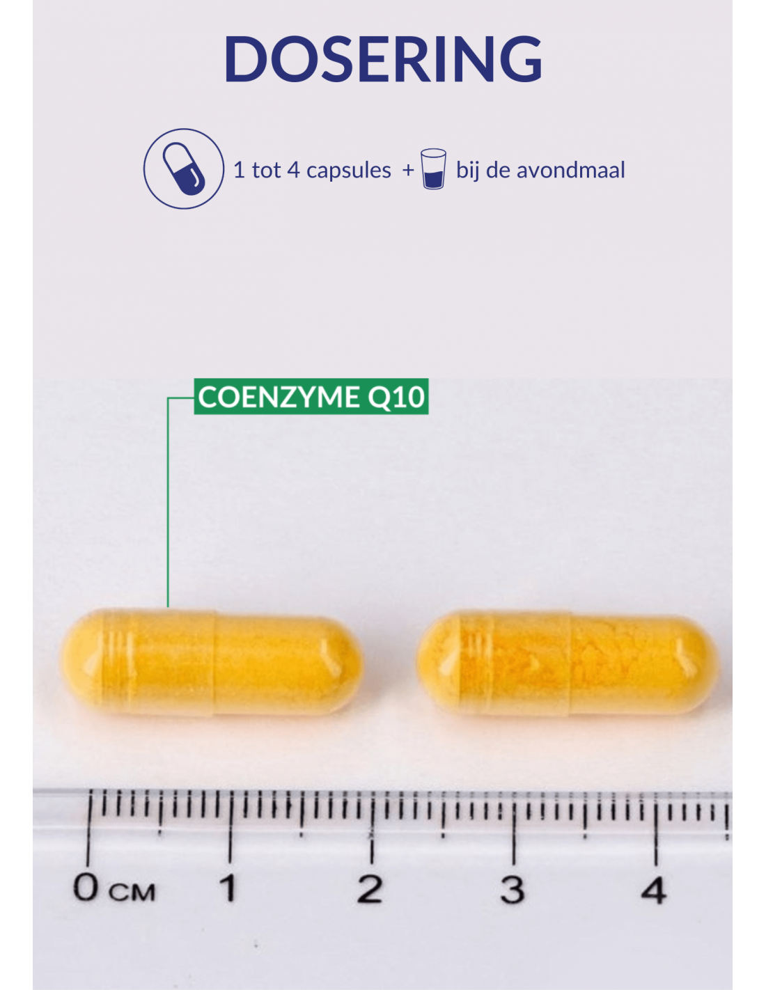 1 capsule per dag met een glas water tijdens de maaltijd. In geval van chemotherapie is medisch advies nodig voordat coëzym Q10 wordt overwogen.