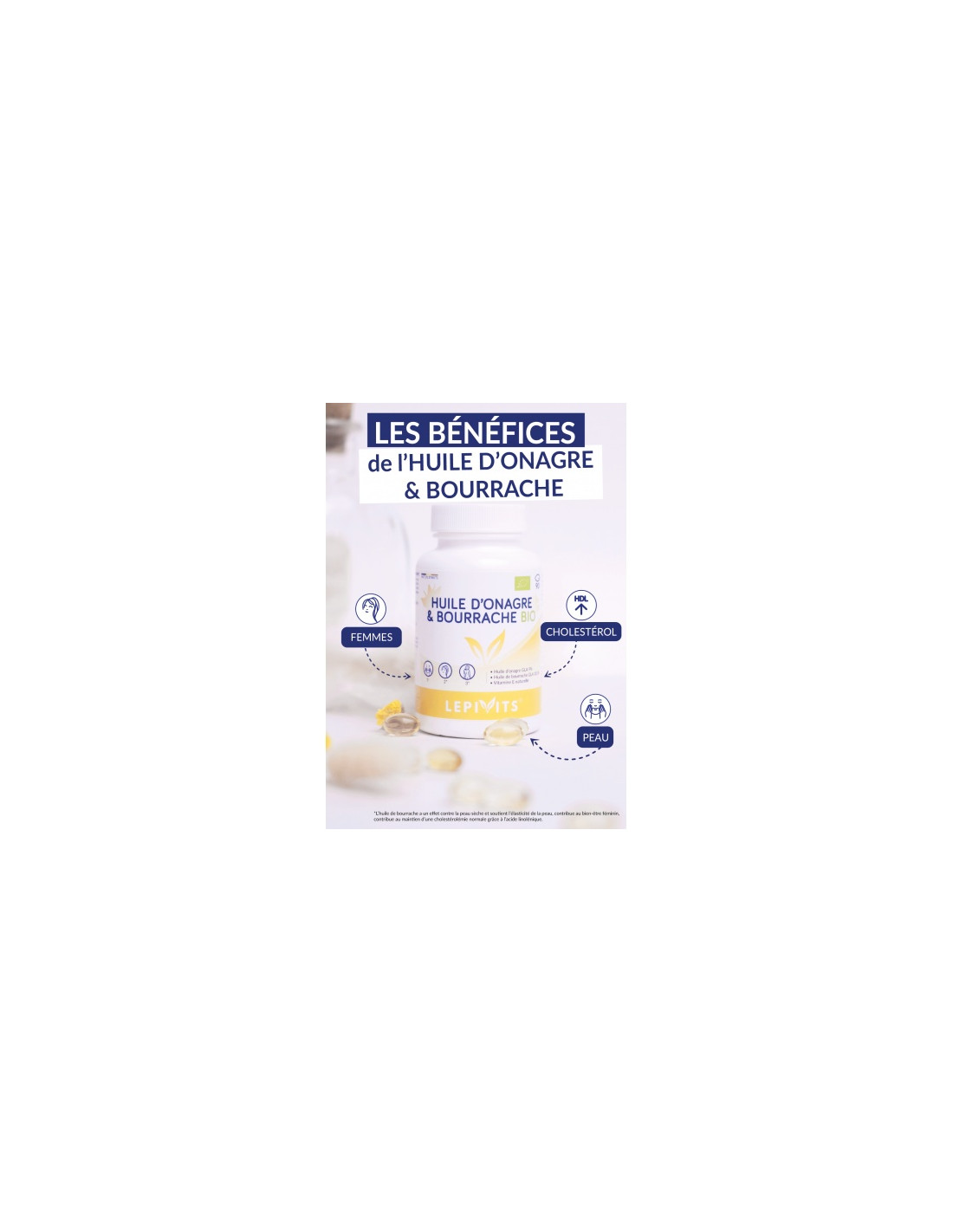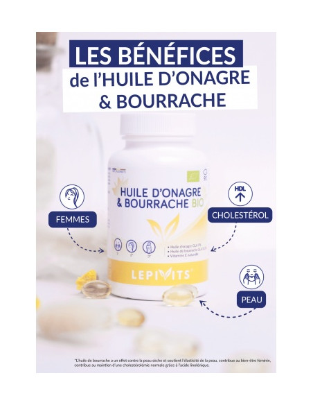 Ons product bevat een concentraat van teunisbloem- en bernagieolie, twee planten bekend om hun rijkdom aan essentiële vetzuren. Bernagieolie wordt gebruikt ter ondersteuning van het welzijn van de huid, het bevordert de hydratatie en elasticiteit ervan. Het draagt ook bij aan het vrouwelijk welzijn, door de lichte schommelingen van het dagelijks leven in evenwicht te brengen.