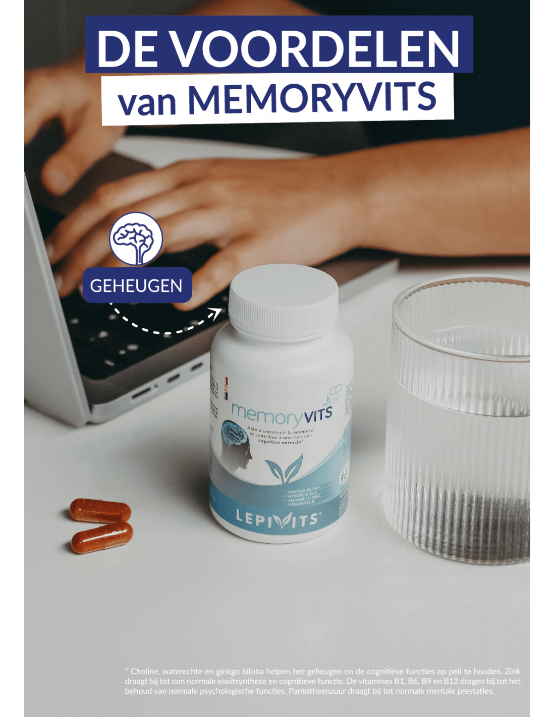 Geconfronteerd met de eisen en stress van het dagelijks leven, die onze cognitieve capaciteiten intensief belasten, biedt Memoryvits een natuurlijke en effectieve oplossing. Dit product is samengesteld uit zorgvuldig geselecteerde actieve ingrediënten, zoals Waterhysop en Ginkgo biloba, verrijkt met de polyfenolen van Memophenol™. Deze componenten zijn gekozen voor hun potentieel om het geheugen en goede cognitieve functies te helpen behouden.