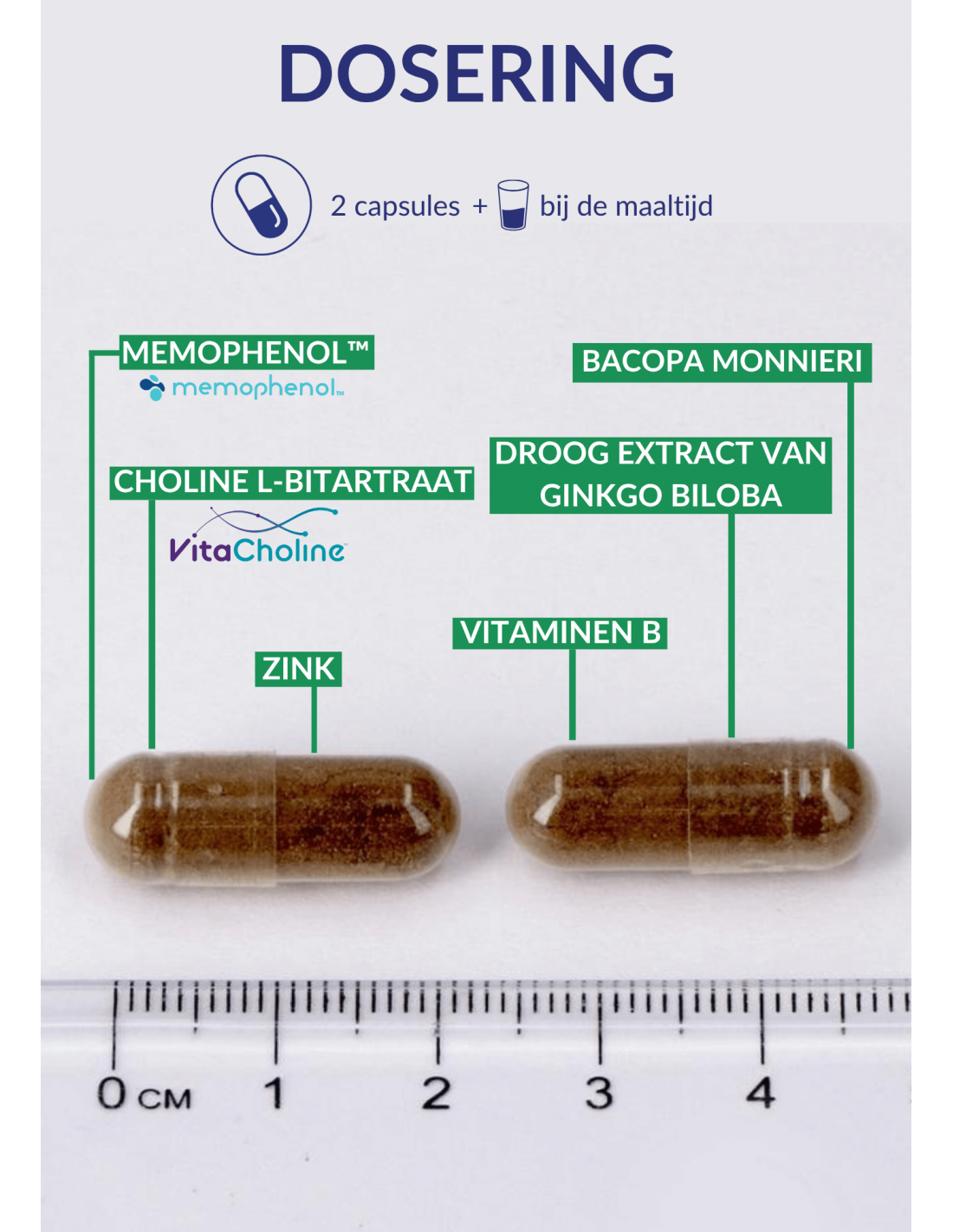 Droog extract van druif (Vitis vinifera L. - vrucht), droog extract van wa- terhyssop (Bacopa monnieri - blad); capsule omhulsel: 100% plantaardig pullulan; droog extract van wilde blauwe bosbes (Vaccinium angustifolium A. - fruit), gedroogd extract van Ginkgo biloba (Ginkgo biloba - blad), cho- linebitartraat, zinkcitraat, vitamine B5 (calcium-D-pantothenaat), vitamine B1 (thiaminehydrochloride), vitamine B6 (pyridoxaal-5'-fosfaat), vitamine B9 ((6S)-5-methyltetrahydrofolinezuur in de vorm van het glucosaminezout), vitamine B12 (methylcobalamine)