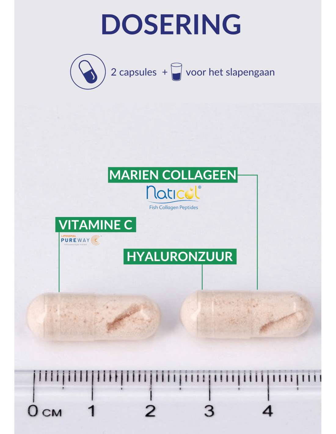 - Collageenpeptiden (Naticol®)**, hyaluronzuur; capsulehuls: 100% plantaar- dig pullulan; vitamine C (Liposomale PureWay-CTM); emulgatoren: fosfolip- iden E322, vetzuren E570; citroenbioflavonoïden.