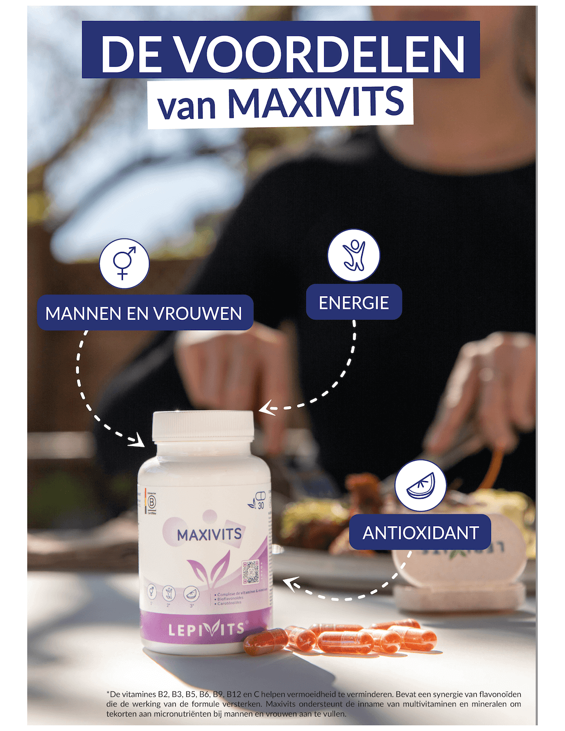 Wat is MaxiVits? MaxiVits, een innovatieve formule, speciaal ontworpen om te voldoen aan de micronutriëntenbehoeften van elk individu, of het nu mannen of vrouwen zijn. Door zorgvuldig een synergie van essentiële vitamines en mineralen voor ons welzijn te combineren met een zorgvuldige selectie van natuurlijke carotenoïden en flavonoïden, biedt MaxiVits de essentiële micronutriënten die nodig zijn voor een goede werking.